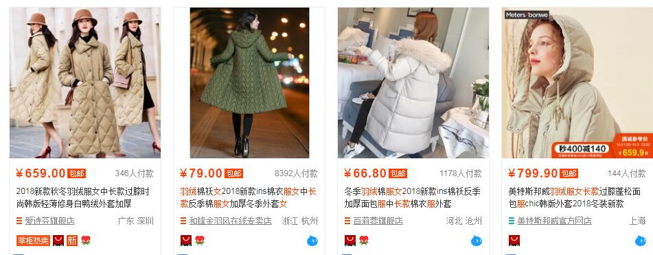 一个店铺想要能够很好的做起来,除了刚才说的那个基础的操作,接下来就是要找到好的款式。我们可以去找类目里的大词或者精准的流量词,比如你去搜索“羽绒服女长款”这个关键词,搜索出来的按照销量排名,看一些优质的商家的产品,综合对比产品的材质,定价以及一些展示出来的卖点,可以不同层次的分别找几家竞争对手来作为标杆,来作进一步调整。