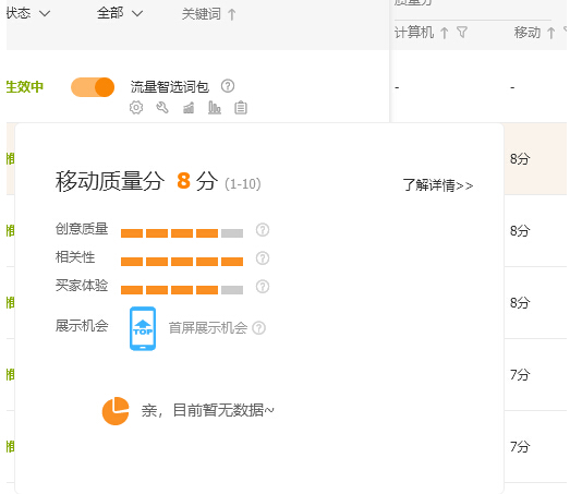 质量分是系统估算的一种相对值,质量得分分为计算机设备质量得分和移动设备质量得分,质量得分是搜索推广中衡量相关性与服务指数和创意性三者之间相关性的综合性指标。质量分是以10分制的形式来体现的,这个分值越高则我们可以获得更理想的推广效果,同时我们的实际扣费PPC相对来说会更低,这个计算依据涉及了多种因素。关键词在推广过程中的质量分越高,说明我们直通车的推广效果越好,关键词的权重比较好,我们也可以用相对来说更少的推广费用来把我们的宝贝信息推送到潜在买家更适当的展示位置上。