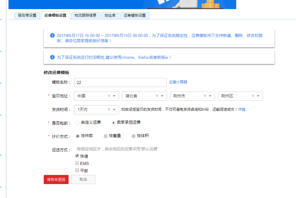 我们可使用我们的物流模板,或者自己设置是否包邮,包邮哪些省份,几件包邮,按件还是按斤包邮,等等