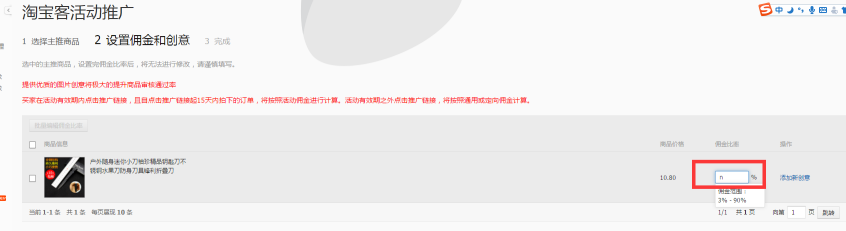 选择产品后设置佣金比。设置佣金的时候可以设置高点,以便于后期的定向招商。后期我们还可以修改编辑佣金比,任何一词淘客佣金的修改都会在晚上24点生效。如果后期这个宝贝不想做了我们就可以删掉它。