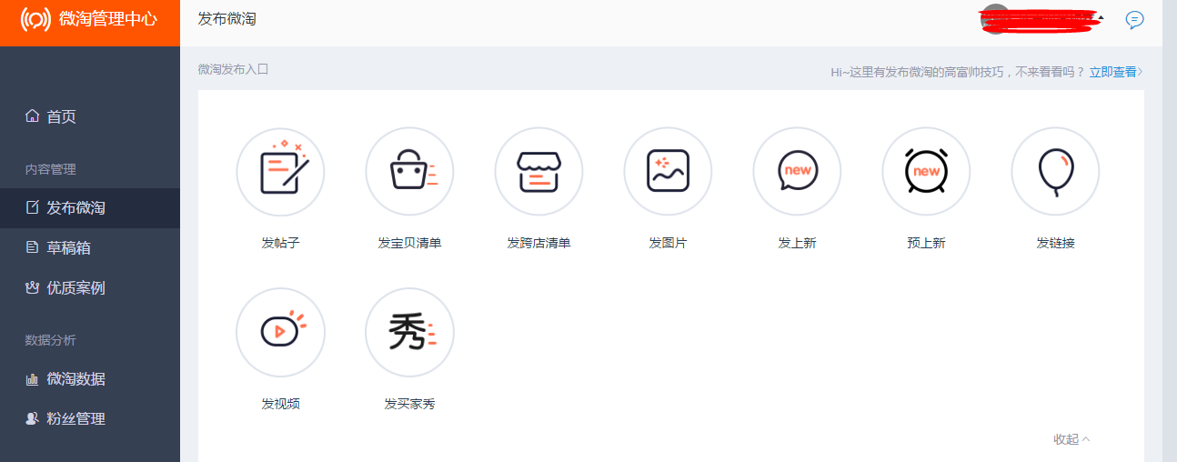 登陆我们的无线运营中心(wuxian.taobao.com)—广播管理—发微淘